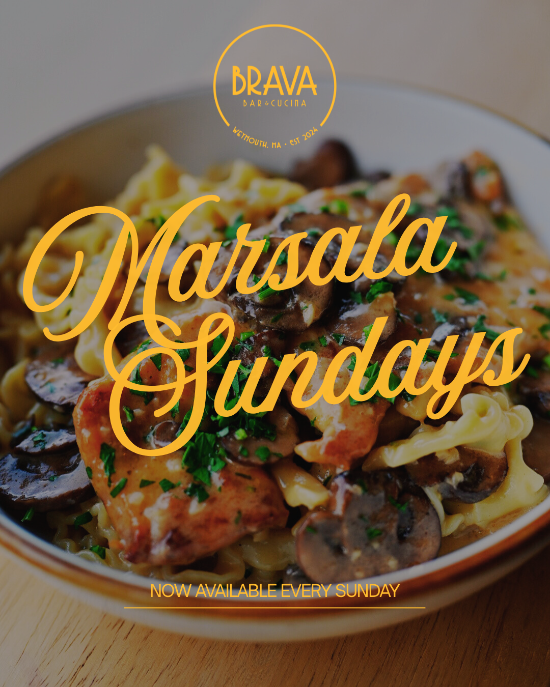 Join us every Sunday for Marsala Sundays at Brava Cucina in Weymouth Landing! We make a limited number of house-cutlets each week for our signature Chicken Marsala — tender, golden-cutlets finished with a rich mushroom and Marsala wine sauce. Available for dine-in and takeout while supplies last. Come early — we’d love for you to try it.